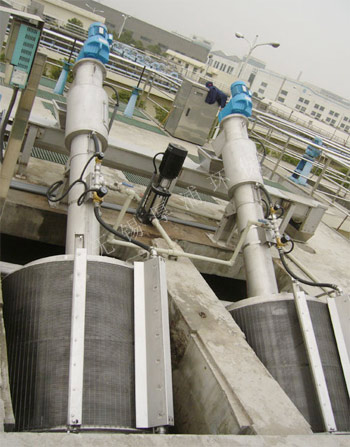 旋轉(zhuǎn)清污網(wǎng)筒在水中以35°傾角做每分鐘5~8r/min的圓周運(yùn)動(dòng),網(wǎng)筒的1/3浸沒在水中。污水及漂浮物從網(wǎng)筒下口進(jìn)入網(wǎng)筒內(nèi)部,漂浮物附著于網(wǎng)筒內(nèi)壁從水中帶出,當(dāng)網(wǎng)筒轉(zhuǎn)到其它高點(diǎn),雜質(zhì)由于重力作用掉入垃圾輸送系統(tǒng),經(jīng)輸送壓榨至出料口。被過濾的污水經(jīng)過網(wǎng)筒間隙流走。